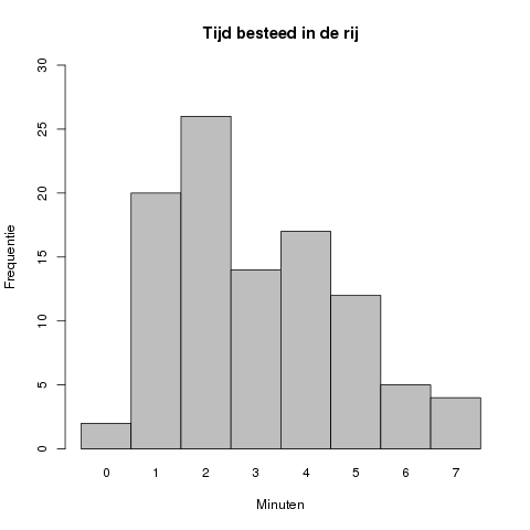In dit geval ligt de piek van de grafiek bij #2# minuten, met een geobserveerde frequentie van #26#.