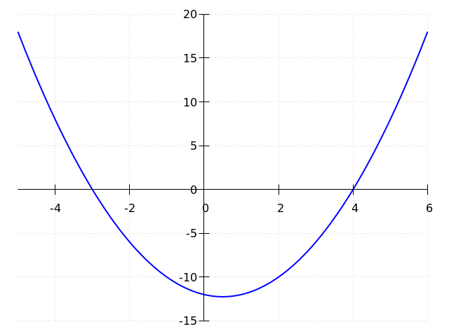 \end{array}\]The graph of the function #y=x^2-x-12# is drawn below. The #x#-coordinates of the meeting points of the graph and the #x#-axis are the solutions to the equation.