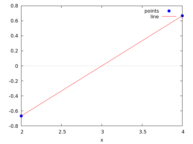 The line is described by the function rule #y=ax+b# where #a# is the slope, given as the quotient of the difference of the #y#-values with the difference of the #x#-values of two points on the line. Hence # a=\frac{{{2}\over{3}}+{{2}\over{3}}}{4-2}={{2}\over{3}}#. The value of #b# follows from #b=y-ax#, where #(x,y)# is a random point on the line. Hence # b=-{{2}\over{3}}-{{2}\over{3}}\cdot2=-2#.